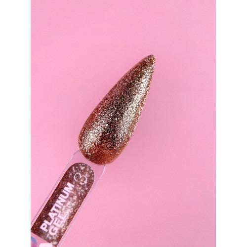 PLATINUM GEL ist ein Glitzer, der reich an mehrfarbigem Glitzer ist. Sie sind mitteldick, breiten sich nicht aus und gelangen nicht unter die Nagelhaut.